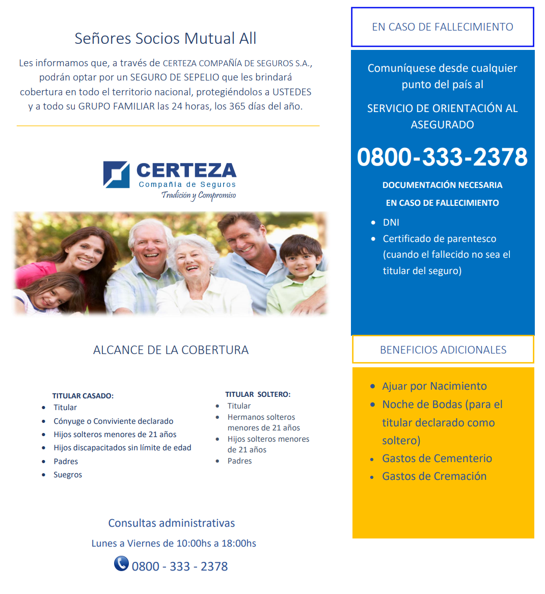 A través de Certeza Compañía de Seguos S.A usted cuenta con un Seguro de Sepelio que le brinda cobertura a nivel nacional, protegiéndolo a usted y a todo su grupo familiar las 24 horas del día, los 365 días del año.